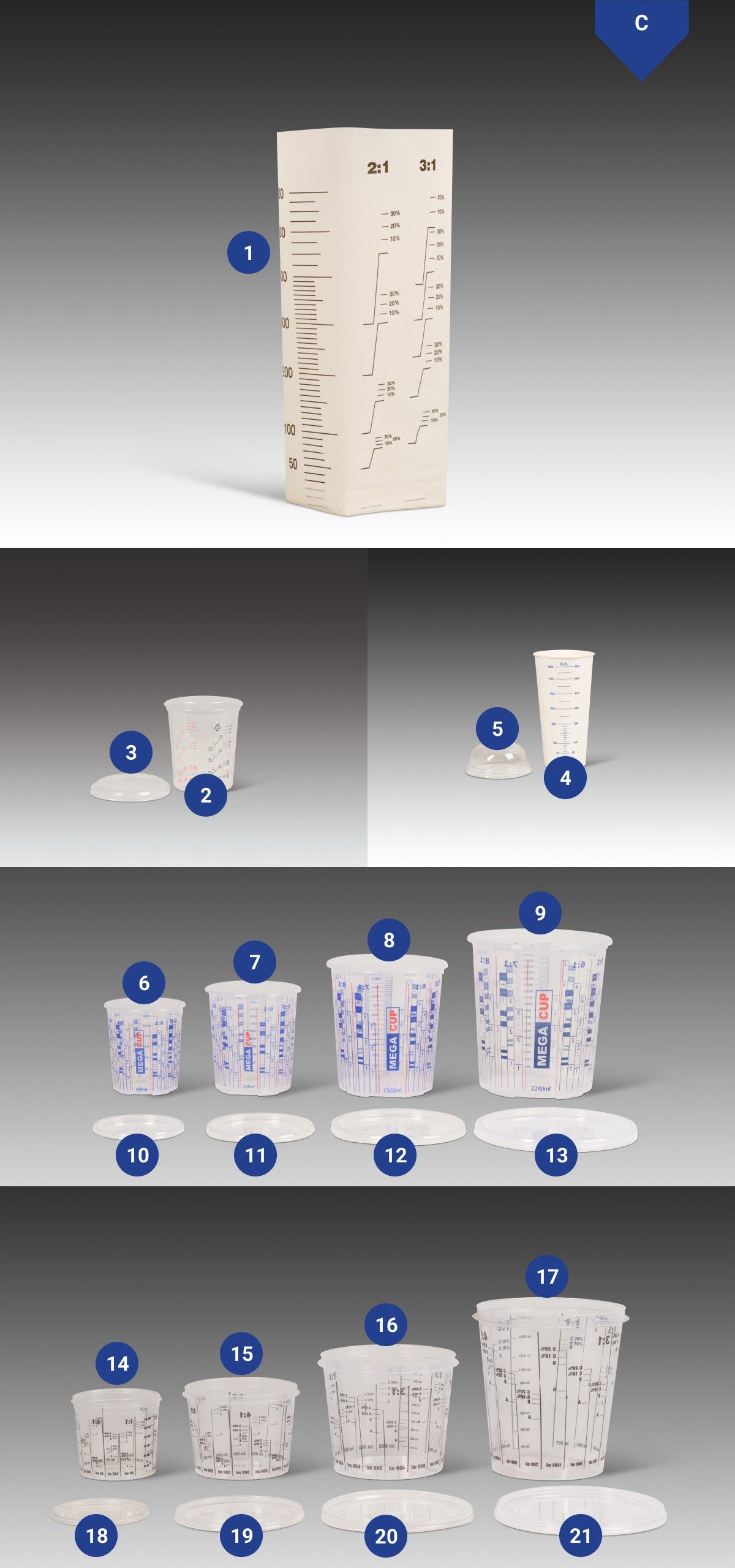 Lackmischbecher aus Pappe und Polypropylen von verschiedenen Größen.  Deckeln sind auch verfügbar.  De Luxe MEGACUP Messlackmischbecher mit Skala bis zu 12:1
