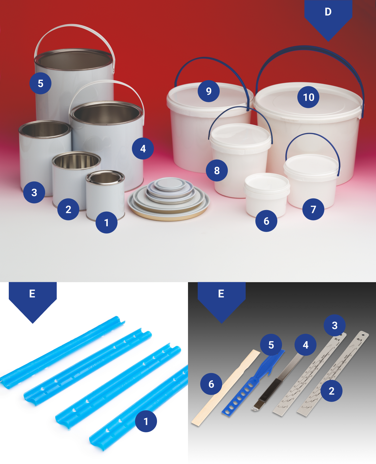 Eine Auswahl an Lackeimern aus Polypropylen für Wasserlack und Blechdosen für lösungsmittelhaltiges Lack - viele Größe verfügbar. Rührstäbe aus Holz, Polypropylen oder Metall mit Skala. Wir können alle Lackvermischungsbedürfnisse gerecht werden.